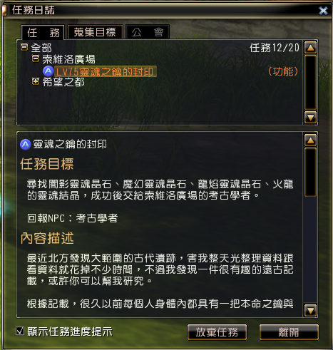 找回「闇影靈魂晶石」、「魔幻靈魂晶石」、「龍焰靈魂晶石」與「火龍的靈魂結晶」四樣遠古晶石。