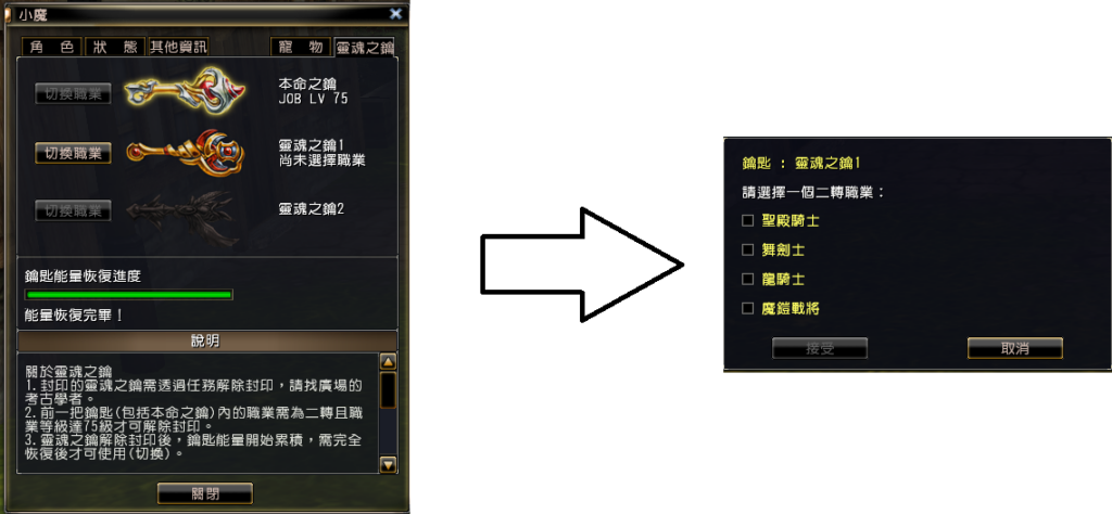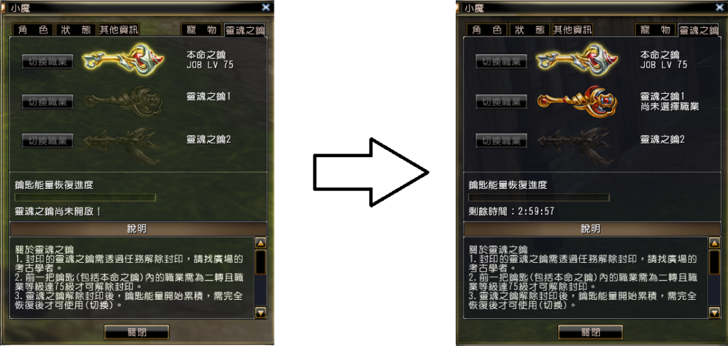 1.解除「靈魂之鑰1」,需「本命之鑰」內的職業等級達75級(含)以上,且是二轉職業。